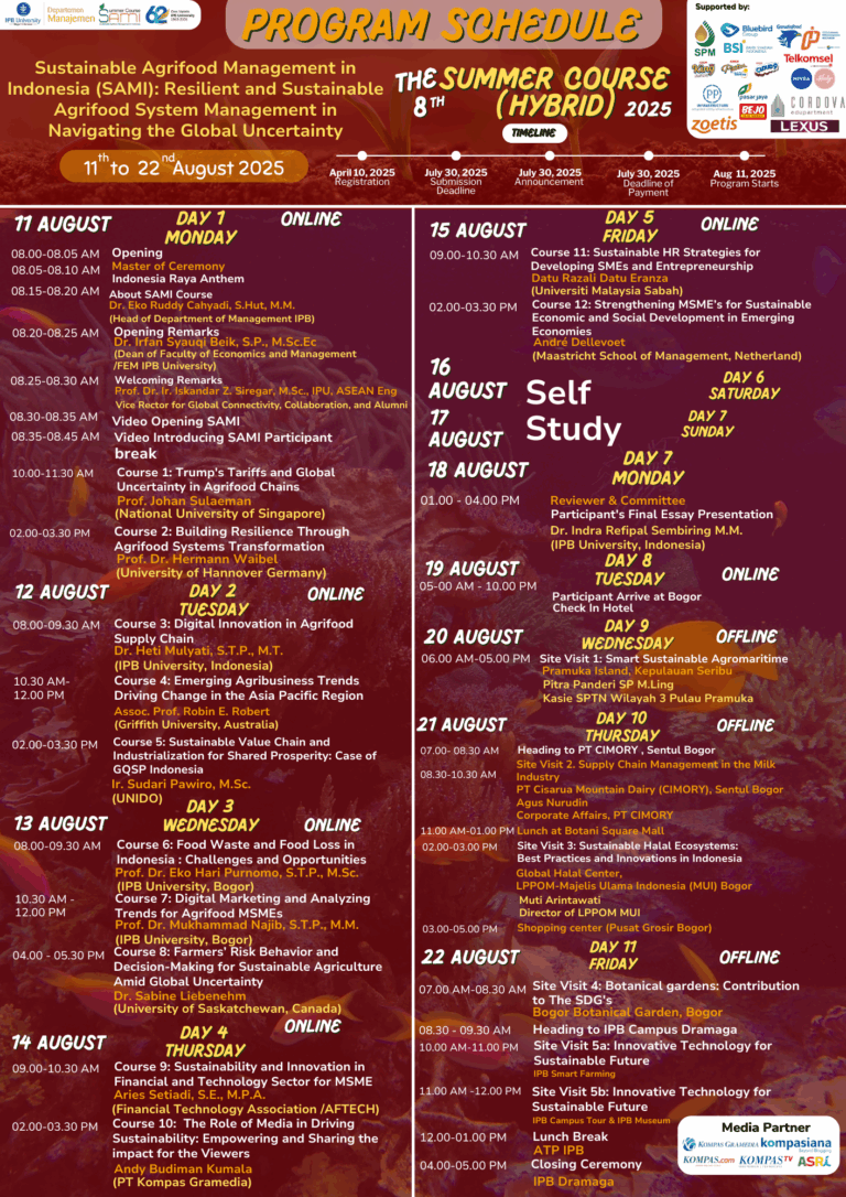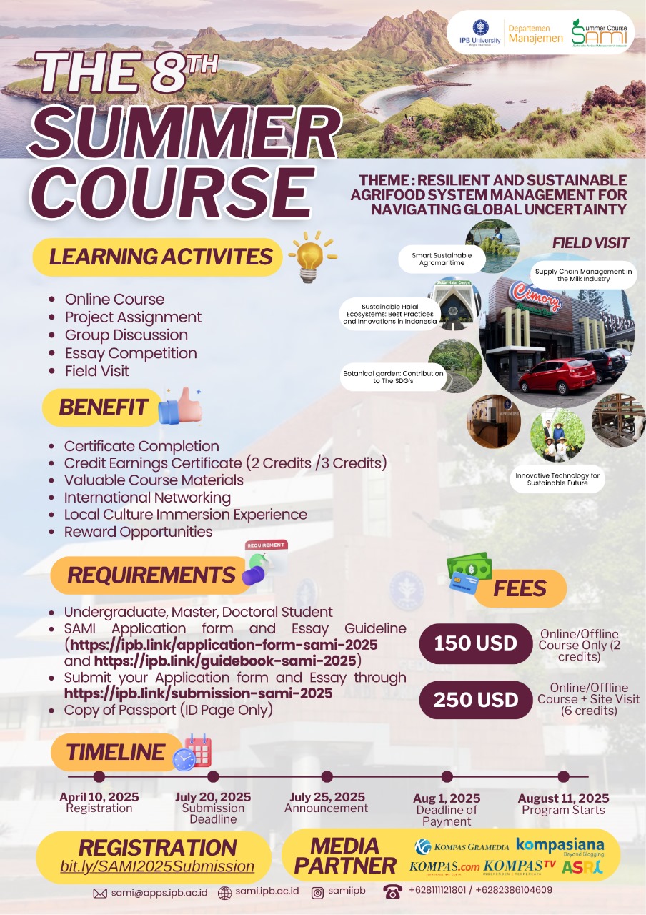 Welcome to the SAMI Summer Course 2025! This international academic program, organized by the Department of Management, Faculty of Economics and Management, IPB University, offers a unique opportunity for students worldwide to explore sustainable agrifood management and global uncertainties.